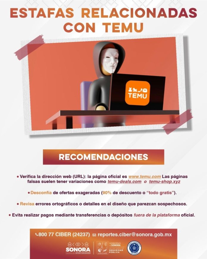 Hermosillo, Sonora; 27 de octubre de 2025.- Con el objetivo de prevenir fraudes en línea relacionados con la plataforma de compras Temu, la Secretaría de Seguridad Pública, a través de la Unidad Cibernética del Gobierno de Sonora, informa a la ciudadanía sobre esta nueva modalidad.